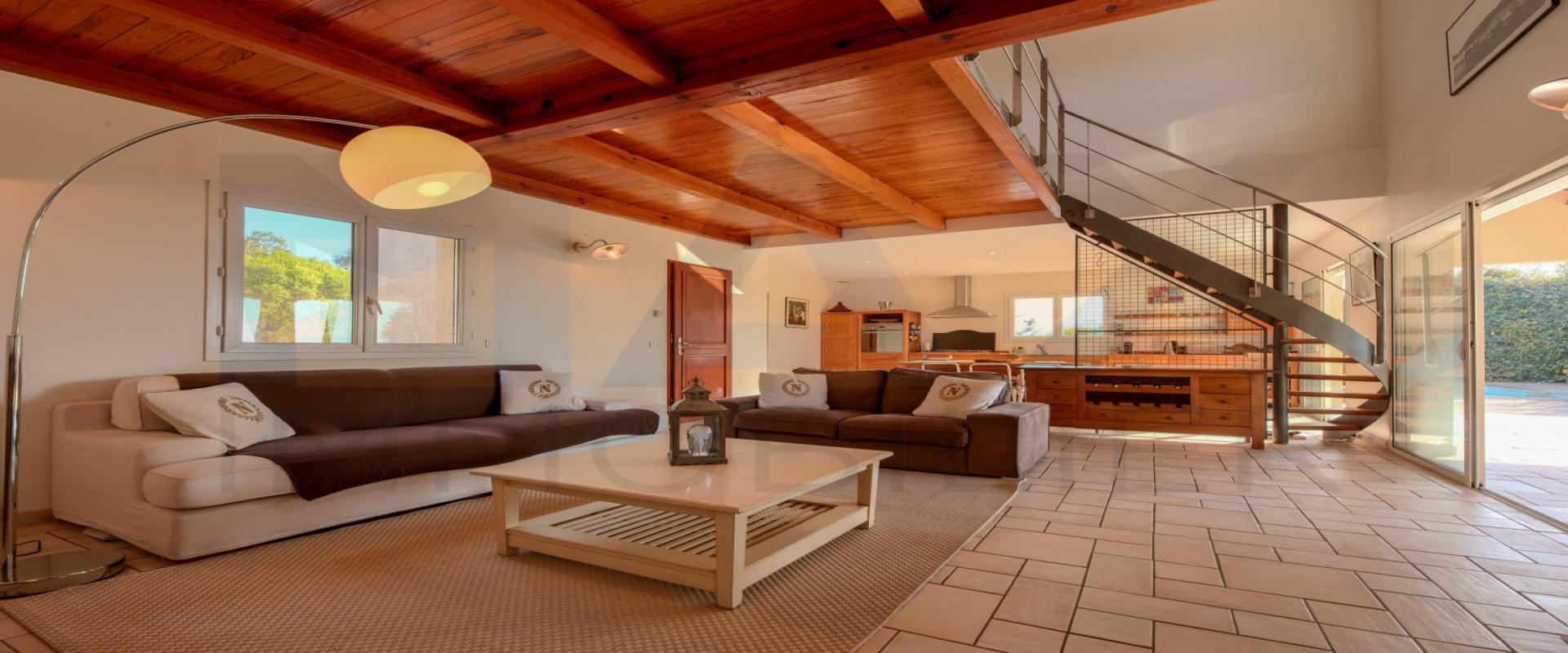 La villa bénéficie d'une exposition plein sud et d'une vue dégagée sur le golfe d'Ajaccio et sur la montagne. Elle possède de larges terrasses , un boulodrome, un garage indépendant et une piscine chauffée de 10.5m X 4.2m.