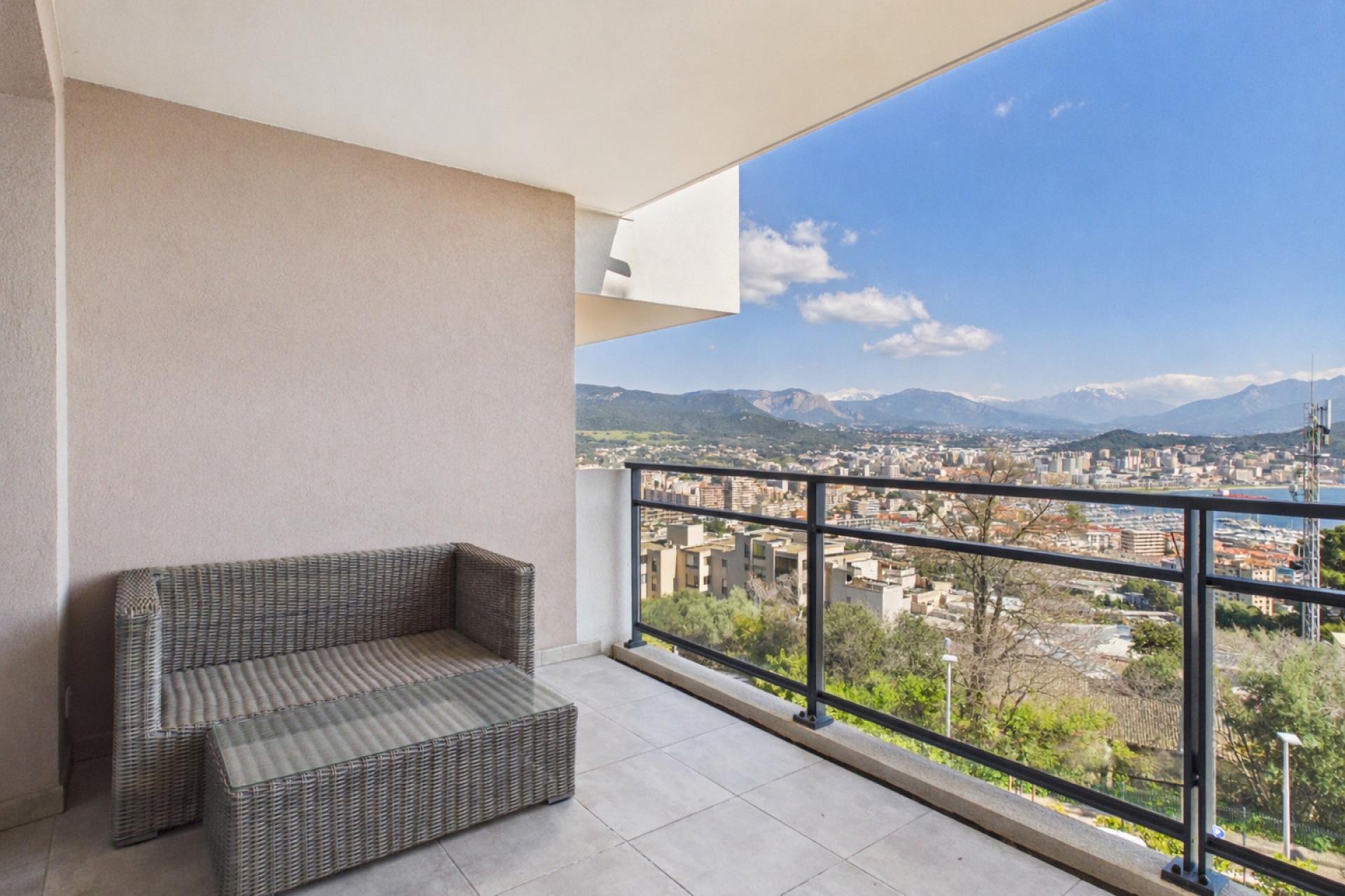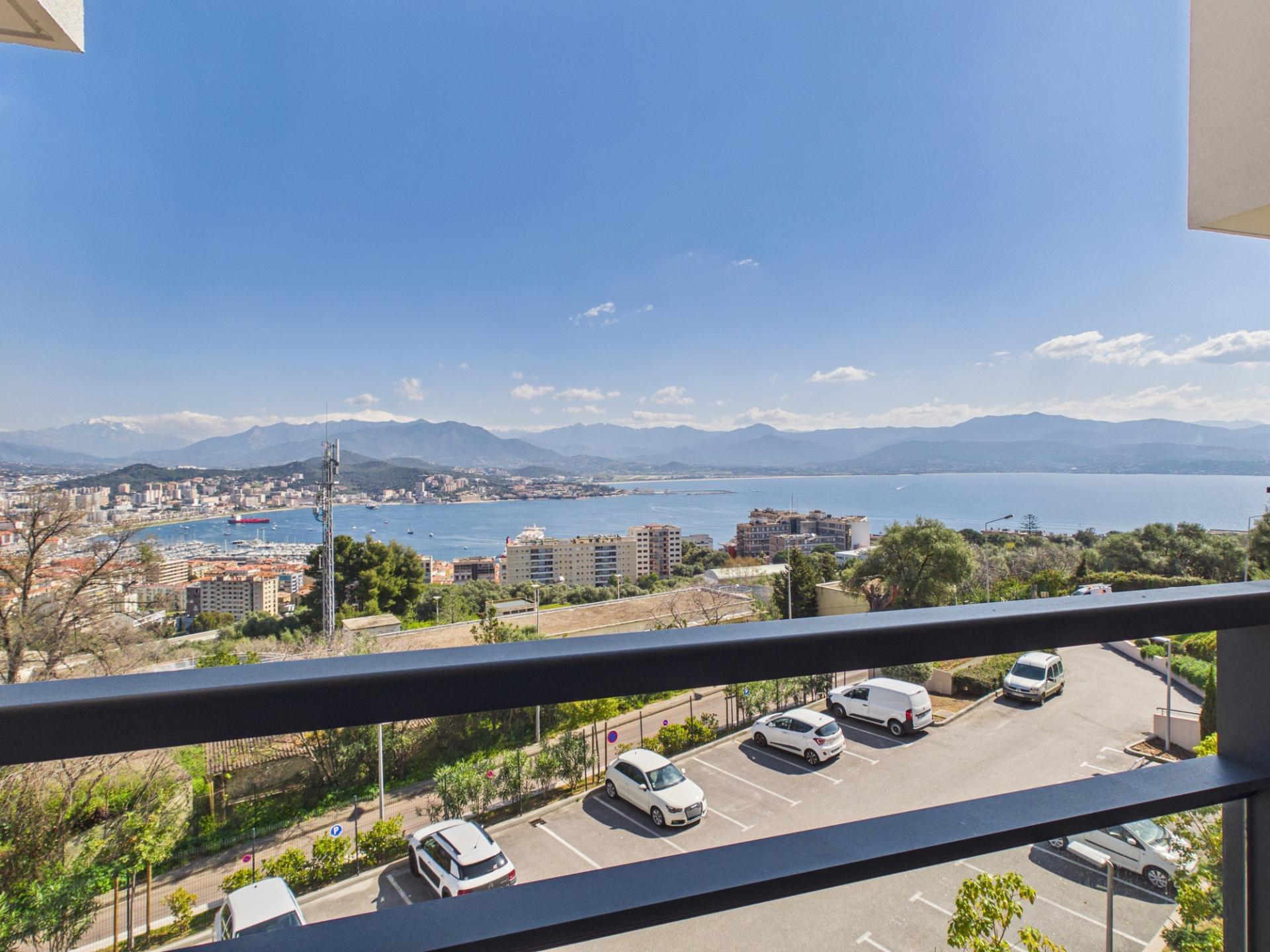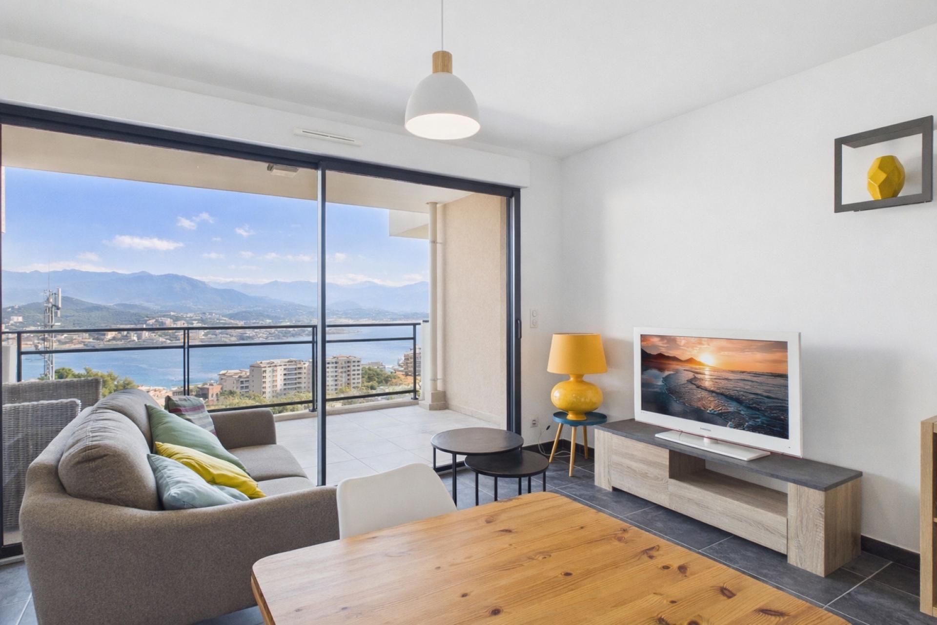 Dès l’entrée, vous serez séduit par le séjour spacieux et traversant, baigné de lumière naturelle. La cuisine, aménagée et équipée, s’intègre harmonieusement à l’espace de vie et s’ouvre sur une terrasse de 9,93 m². Cet extérieur, véritable prolongement du salon, est l’endroit idéal pour profiter des petits déjeuners ensoleillés ou des soirées face à la mer. La vue dégagée sur l’horizon marin et la ville d’Ajaccio en fait un atout majeur de ce bien.