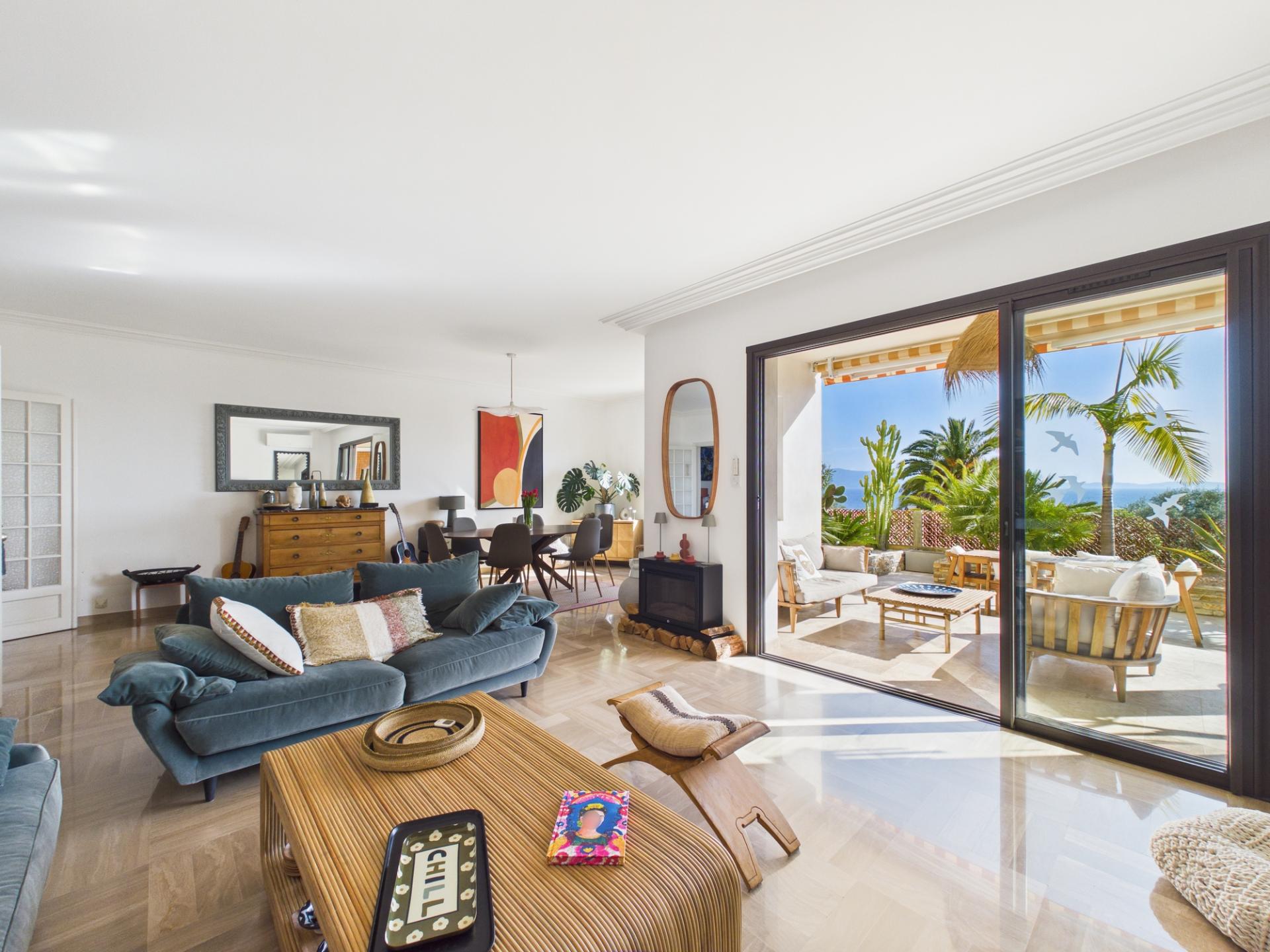Dès l’entrée, vous découvrirez un hall accueillant menant à un vaste séjour de plus de 42 m², véritable cœur de l’appartement. Cet espace de vie généreux et lumineux s’ouvre sur la terrasse couverte, idéale pour profiter de moments conviviaux face à la mer.