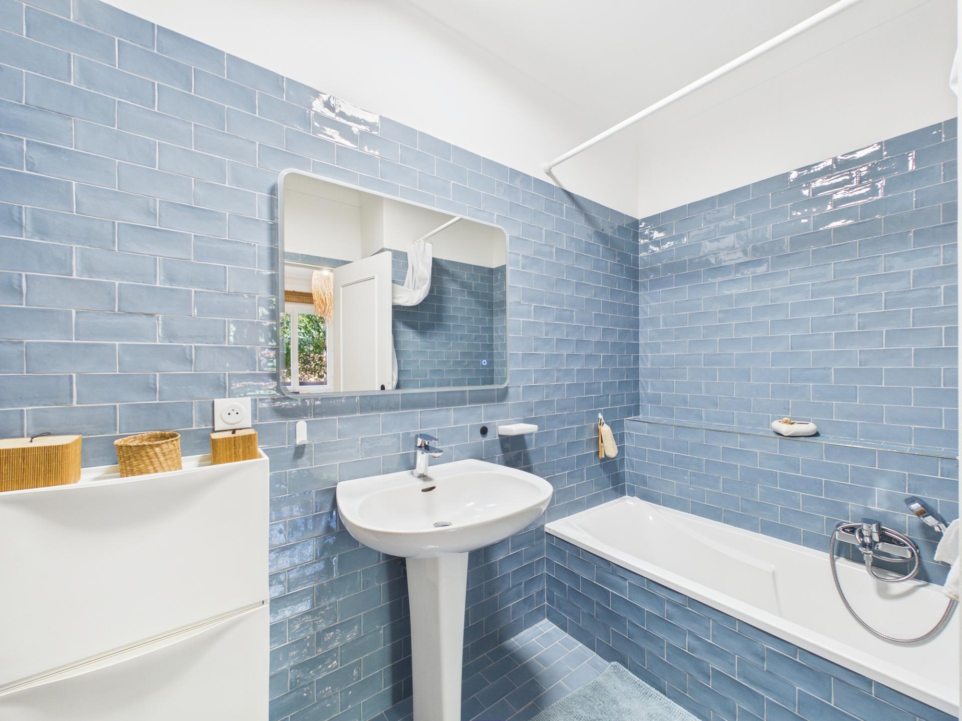 L’appartement dispose également d’une salle d’eau avec douche à l’italienne, d’une salle de bain avec baignoire, ainsi que d’un WC séparé suspendu, garantissant confort et fonctionnalité au quotidien.